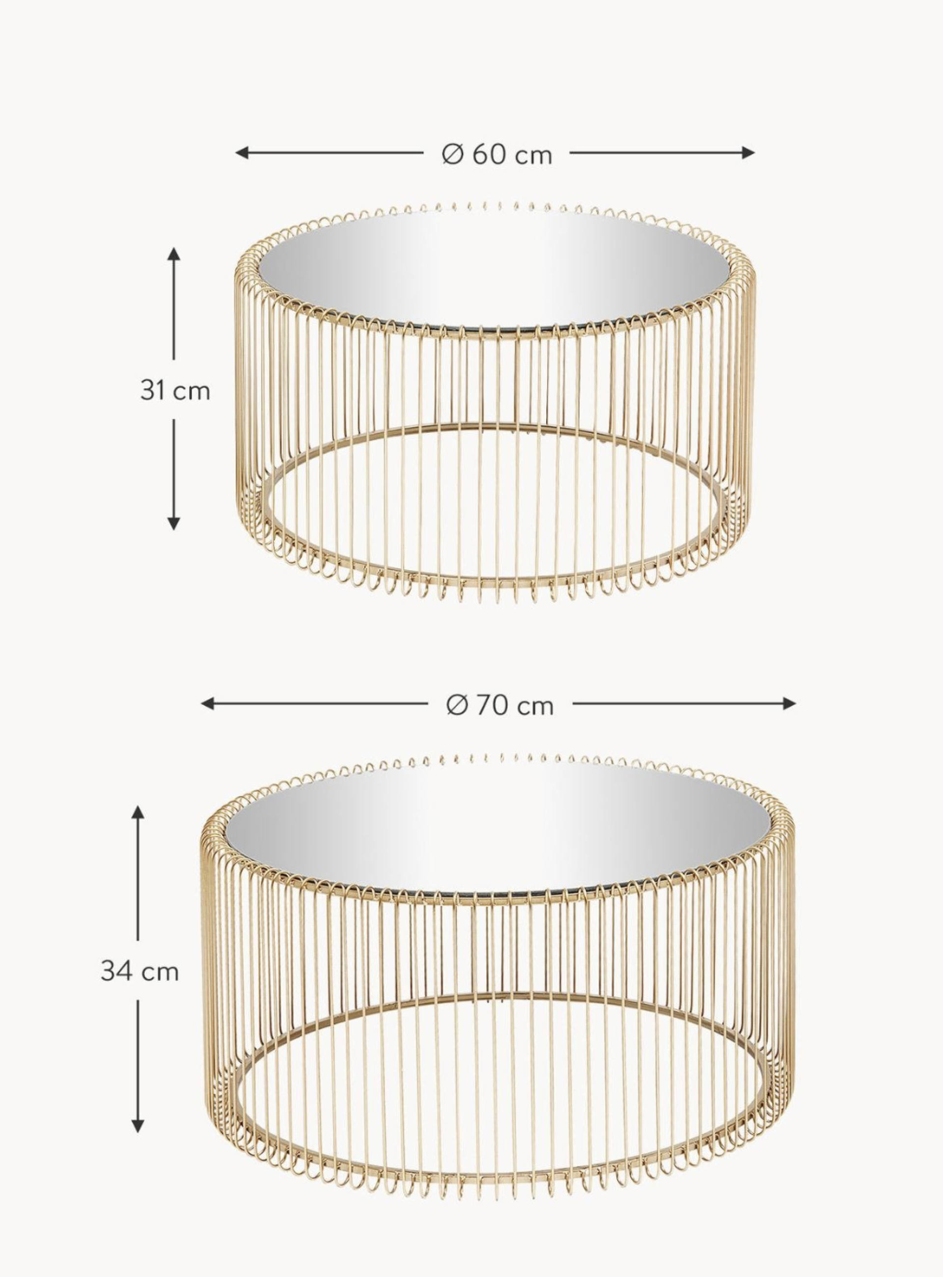 Veľkosť stolík 1: Ø 70 cm | V 34 cm Veľkosť stolík 2: Ø 60 cm | V 31 cm Hrúbka skla: V 5 mm